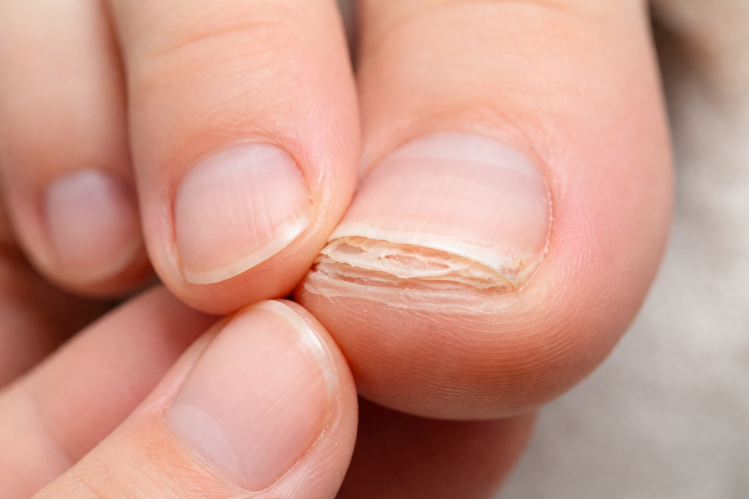簡単に言うと、爪が一枚ではなく、何枚も重なっているように見える状態を指すことが多いと言われています。表面がめくれていたり、段差ができたりして、「爪が二重になっているように見える」と感じる人もいます。